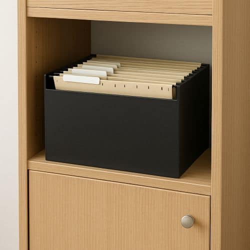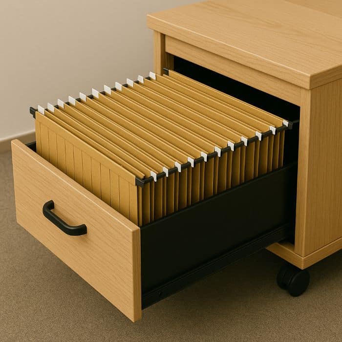 Es gibt viele Systeme, die entweder ausziehbar in einen Büroschrank oder Rollcontainer  integriert werden können (etwas teurer)oder Hängeordnerboxen, die man einfach ins Fach oder bei aktuellem Bedarf auch einmal auf den Schreibtisch  kann.